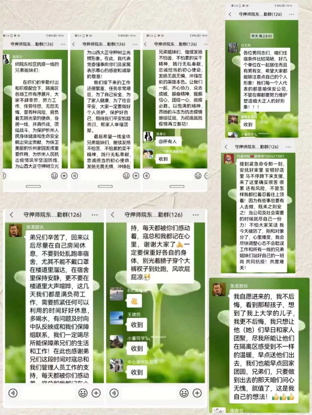 此外,頓村棚戶區(qū)、師院主校區(qū)、民兵應(yīng)急、醫(yī)療機構(gòu)、交通樞紐等其它五支突擊分隊全體參戰(zhàn)隊員在做好自身防護的前提下,積極配合相關(guān)單位履職盡責(zé)。在第二方艙醫(yī)院和龍崗二區(qū)、頓村棚戶區(qū)隔離點執(zhí)行外圍警戒的直屬公司和機關(guān)部門人員,不懼危險、堅守崗位,時刻保持高度警惕,輪班值守重要通道,嚴(yán)禁無關(guān)人員進入隔離地帶、破壞隔離設(shè)施,確保隔離點和方艙周邊安全有序;在師院主校區(qū)、頓村棚戶區(qū)隔離點執(zhí)行餐食物資配送的機關(guān)部門和物業(yè)公司人員,不辭辛勞、上下奔波,及時把美味、可口、溫?zé)岬娘埐怂偷礁綦x人員手中,像一抹抹溫暖的陽光,用溫情守護讓隔離人員安心、舒心;在市醫(yī)院、中醫(yī)院、忻州西站等處在執(zhí)行秩序維護的保安直屬公司人員,認(rèn)真把關(guān)、仔細查驗進出人員的“三碼一溫”,有力地保障了重點部位疫情防控期間的安全穩(wěn)定運行。