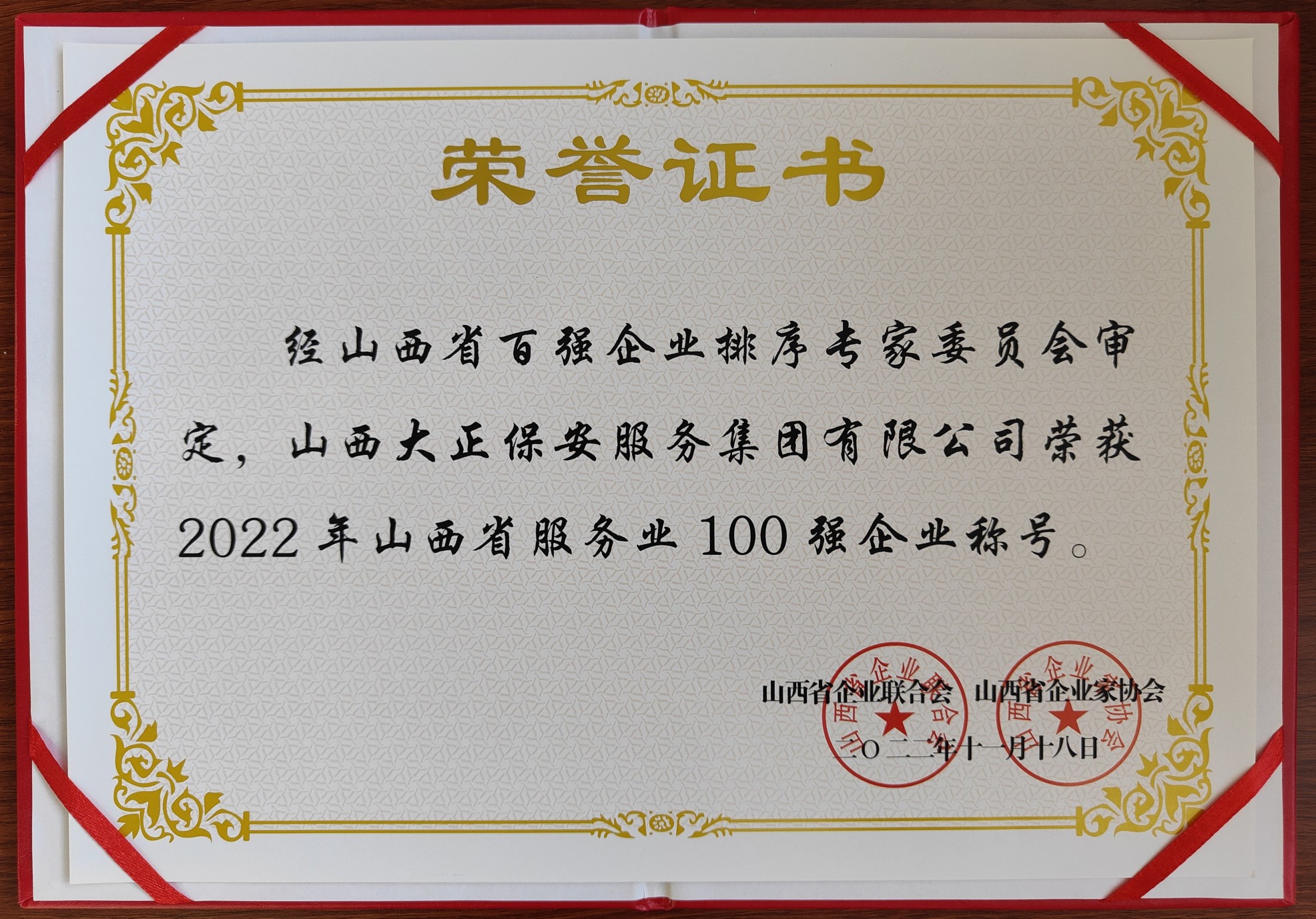 12月20日,山西省企業(yè)聯(lián)合會(huì)、山西省企業(yè)家協(xié)會(huì)召開第30次年會(huì)暨2022山西企業(yè)100強(qiáng)發(fā)布會(huì)。山西大正保安服務(wù)集團(tuán)有限公司入圍“2022山西服務(wù)業(yè)企業(yè)100強(qiáng)”、榮獲“2020-2021年度優(yōu)秀企業(yè)”稱號(hào),黨委副書記、總經(jīng)理趙培宏榮獲“2020-2021年度優(yōu)秀企業(yè)家”稱號(hào)。