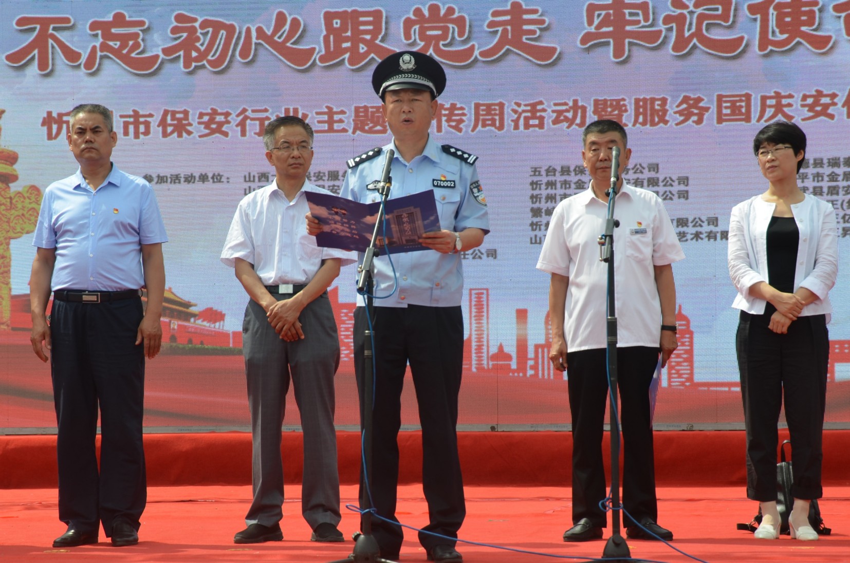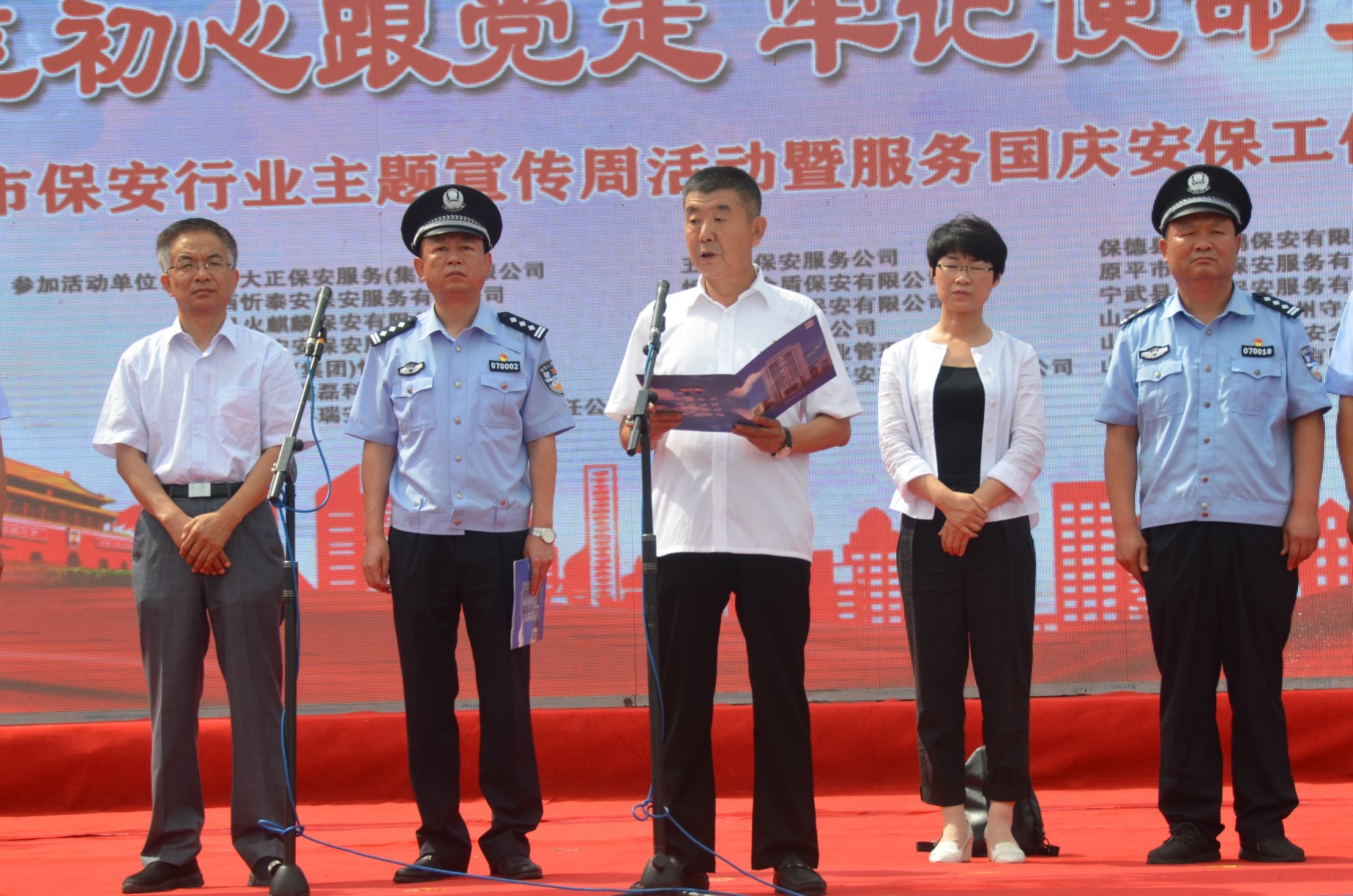 市總工會常務(wù)副主席王書鴻,市婦聯(lián)辦公室主任王軼男,市人社局保險科科長溫秀偉,市公安局治安支隊負(fù)責(zé)人王新策,市公安局直屬分局局長楊德華,市公安局忻府分局局長張鵬,市公安局直屬分局副局長劉建強(qiáng)出席儀式。市保安協(xié)會副會長、山西大正保安服務(wù)有限公司黨委委員、副總經(jīng)理趙培宏主持儀式并宣布主題宣傳周活動正式啟動。市保安協(xié)會副會長、山西大正保安服務(wù)有限公司黨委委員、副總經(jīng)理王明生出席儀式并宣讀主題宣傳周活動實施方案。全市18家保安企業(yè)負(fù)責(zé)人、保安隊員代表500余人參加儀式。在忻參加全省守押行業(yè)素質(zhì)提升在崗輪訓(xùn)的各地市守押企業(yè)隊員100余人應(yīng)邀參加儀式。