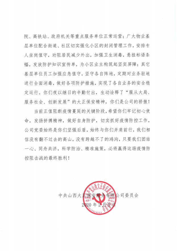 致公司疫情防控一線全體黨員、干部、員工的慰問(wèn)信