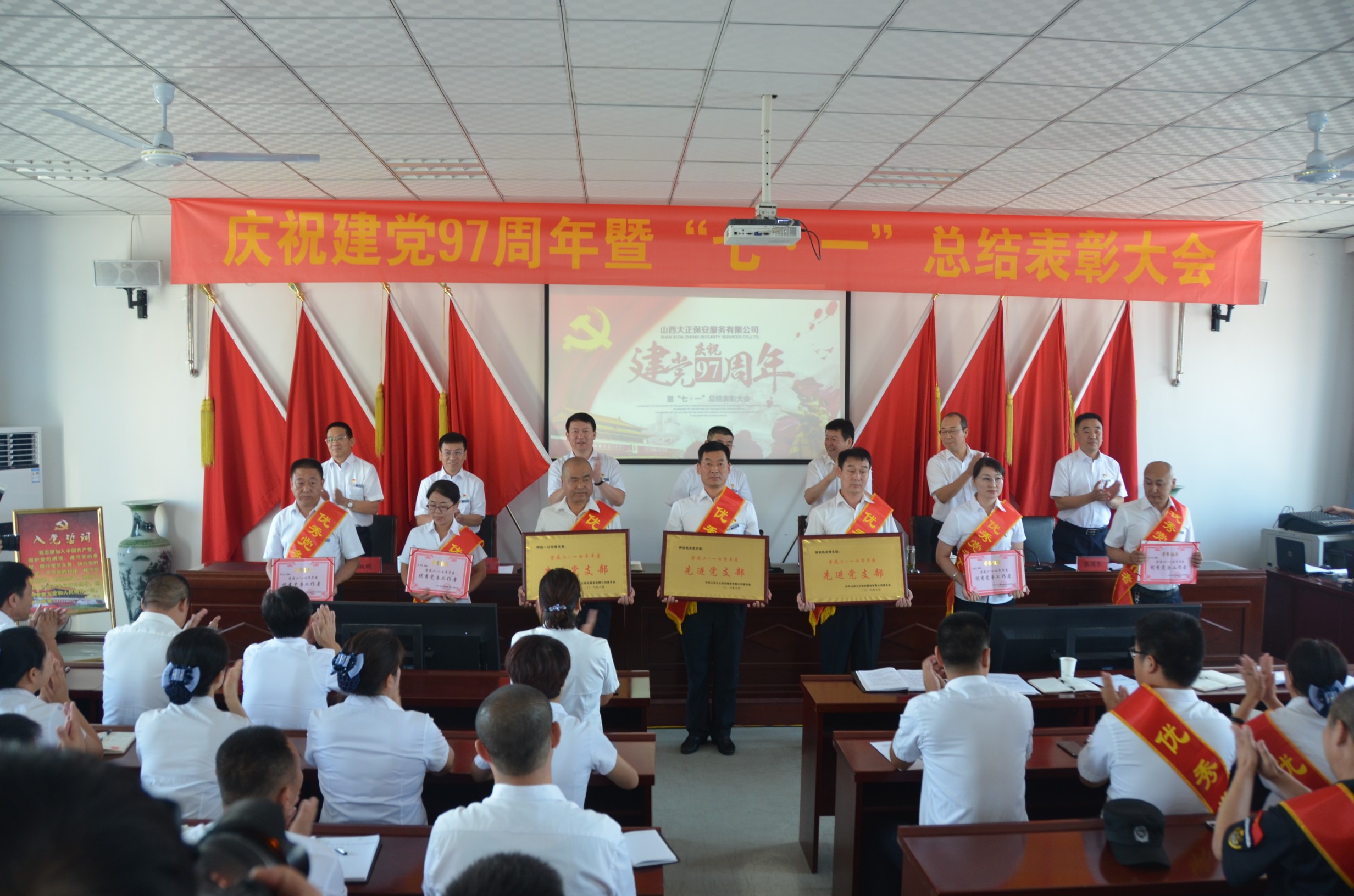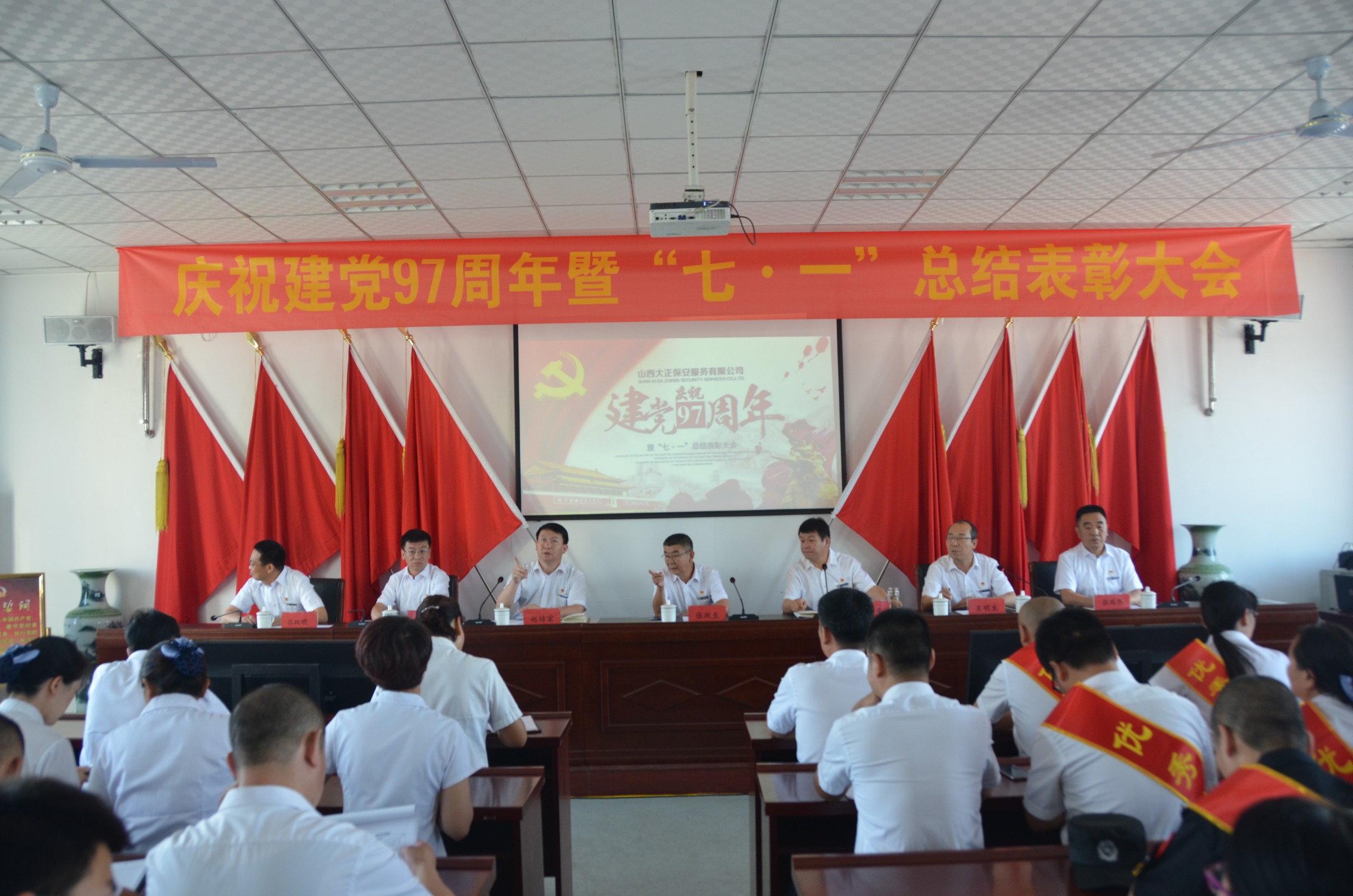 為慶祝建黨97周年,回顧總結公司一年來黨建及其它各項工作取得的新進展、新突破、新成果,安排部署下一階段黨建及其它各項工作,6月30日上午9時,山西大正保安服務有限公司在總公司會議室隆重召開了“慶祝建黨97周年暨“七·一”總結表彰大會”?偣靖鞑块T、各分公司、各縣、市、區(qū)基層中隊分別在主會場、分會場收聽、收看了大會實況。出席大會的領導有張躍生、陳志平、趙培宏、王雙明、邢春生、張瑞東、呂雙明,大會由王明生同志主持。