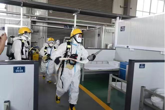 上午8點30分,隊員們準時抵達忻州市方艙醫(yī)院,對方艙醫(yī)院滅火器、水閥、消防槍頭、消防水帶等所有消防設施進行了全面的檢查。在炎炎夏日30度的高溫天氣下,隊員們不僅穿著消防服,還需加套醫(yī)用防護服,每次穿著脫下來時都是汗流浹背把衣服都浸濕了,但隊員們一次又一次的努力掌握如何正確、快速完成穿著練習,大家不急不躁,情緒始終高漲。