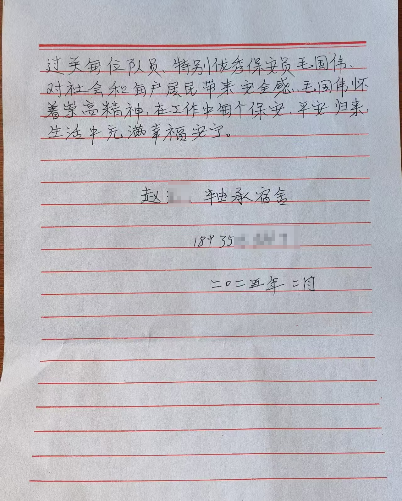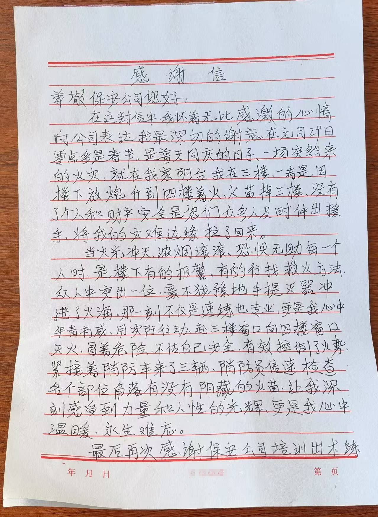 在感謝信中,兩位老人用質(zhì)樸的語言表達(dá)了對(duì)毛國偉的深深感激,并對(duì)忻州市保安服務(wù)公司表示高度贊揚(yáng)。此次應(yīng)急處置事件不僅展現(xiàn)了毛國偉個(gè)人的專業(yè)素養(yǎng)和勇敢精神,更是忻州市保安服務(wù)公司注重安全生產(chǎn)、常態(tài)化開展消防安全培訓(xùn)和應(yīng)急處突演練的成果體現(xiàn)。